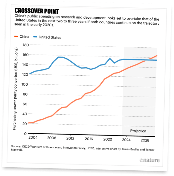 The global science funding map is being redrawn - and the implications for AI are massive. A new forecast by UC San Diego researchers, published exclusively in Nature Index, projects that China will overtake the United States as the world's largest public funder of research by 2028, give or take a year. The numbers are striking: China's government R&D spending surged 90% over the past decade to $133 billion, while U.S. spending grew just 12% to $155 billion.