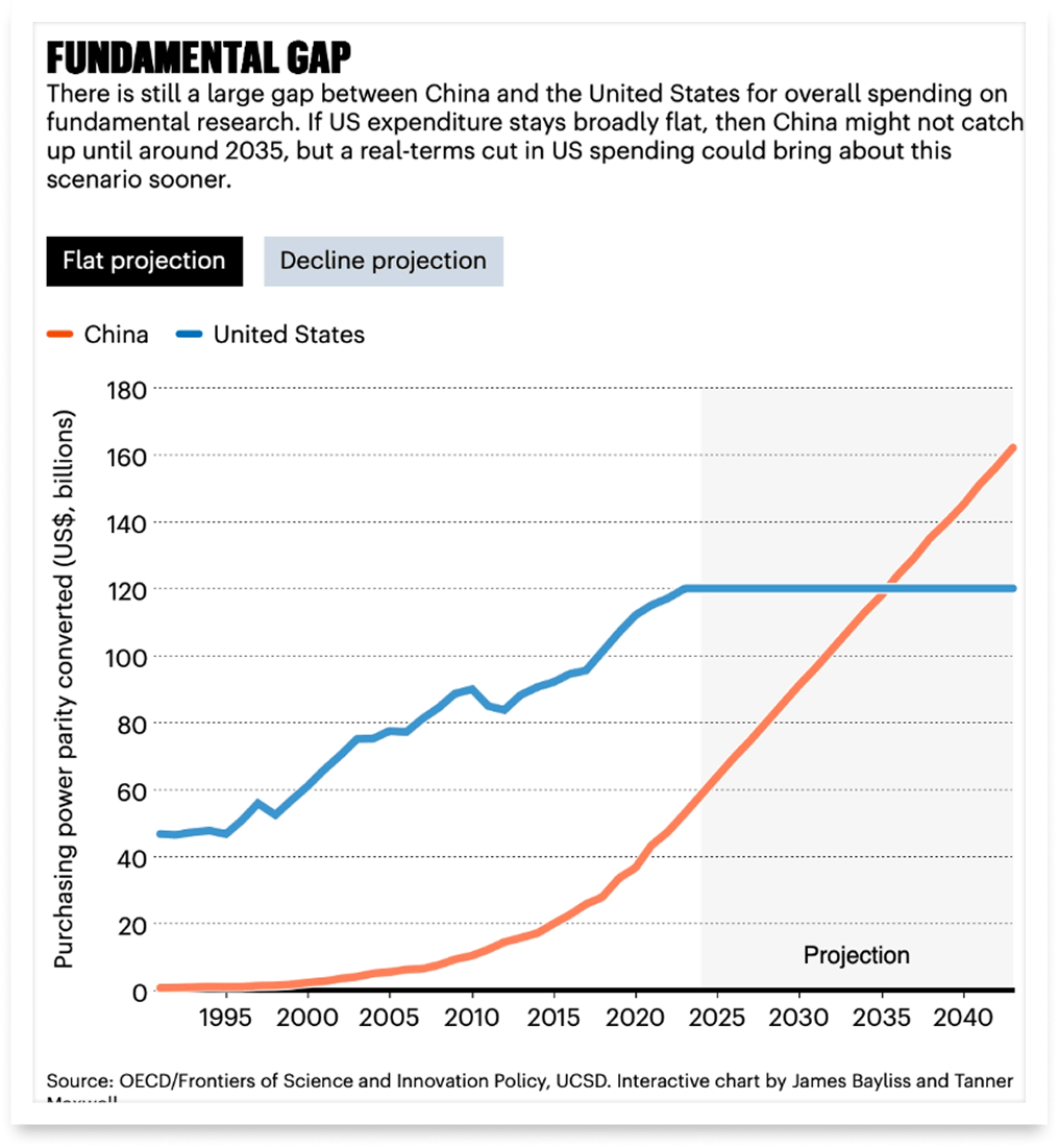 The country that funds the most research attracts the best talent and sets the direction for breakthrough technologies, including AI. This funding crossover could reshape which nation leads the next generation of scientific and technological innovation.