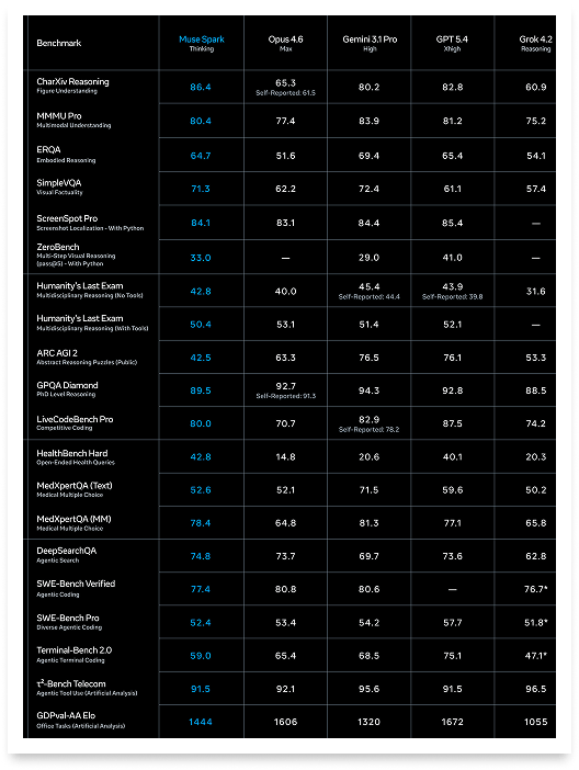It dominates health benchmarks, beating all rival models on HealthBench Hard with a score of 42.8%, and excels in visual understanding. But Meta is honest about the gaps: coding and long-horizon agentic tasks remain weak spots, with Terminal-Bench scores trailing GPT-5.4 significantly.