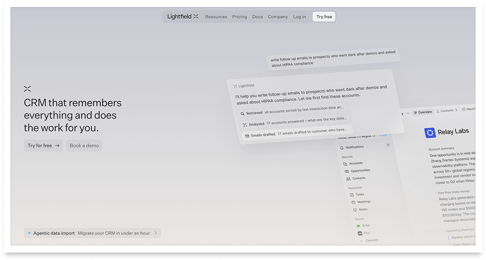 Lightfield solves this by capturing every email, meeting, and transcript automatically to build a "centralized memory" of your business. This is their real superpower: unlike other tools that just give you a pile of transcripts, Lightfield stitches every conversation into a continuous understanding of the relationship so you never lose a key detail again. Then, it puts that context to work: